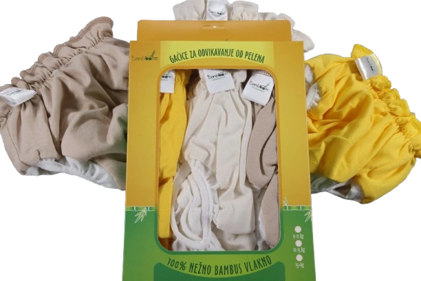 Bamboooz gaćice za odvikavanje od pelena su napravljene od 3 sloja različitih materijala, unutrašnji sloj je od 100% bambus vlakna, preko njega ide nepropusni sloj i spolja je pamučni ukrasni sloj.